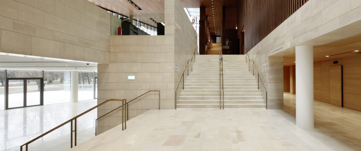 The Musiktheater Linz was built as the new Landestheater Linz venue for opera, operetta, ballet and musicals. Whereas the main building and the other cultural facilities are located in the north of the city on the banks of the River Danube, the musical theatre is in the south of downtown, in the direct vicinity of the main station. Since 1990 various sites had been in discussion but were ultimately rejected or, following a referendum, abandoned. The current location in the southern section of Linzer Landstrasse has also become an important impetus in terms of urban development. The building is directly adjacent to Volksgarten, the city’s largest downtown park.